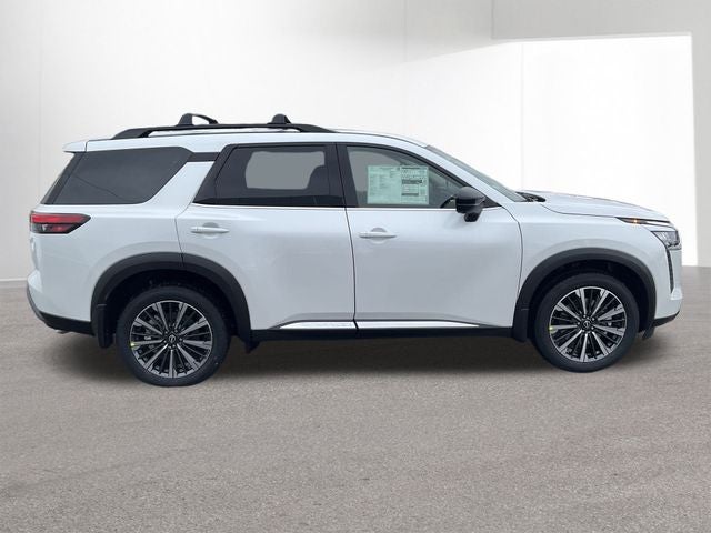 Pathfinder Platinum is nicely equipped with Cargo Package (Cargo Area Protector, Cargo Net, and First Aid), 4WD, 13 Speakers, 3rd row seats: bench, 4-Piece Black Splash Guards, 4-Wheel Disc Brakes, ABS brakes, Air Conditioning, Alloy wheels, AM/FM radio: SiriusXM w/360L, Auto High-beam Headlights, Auto tilt-away steering wheel, Auto-dimming Rear-View mirror, Automatic temperature control, Bench Seat Carpeted Floor Mats, Bodyside moldings, Bose Premium Audio System, Brake assist, Bumpers: body-color, Climate Controlled Front Bucket Seats, Cross Bars, Delay-off headlights, Driver door bin, Driver vanity mirror, Dual front impact airbags, Dual front side impact airbags, Electronic Stability Control, Emergency communication system: NissanConnect Services, Four wheel independent suspension, Front anti-roll bar, Front Bucket Seats, Front Center Armrest, Front dual zone A/C, Front reading lights, Fully automatic headlights, Garage door transmitter: HomeLink, Heads-Up Display, Heated door mirrors, Heated front seats, Heated rear seats, Heated steering wheel, Illuminated entry, Knee airbag, Low tire pressure warning, Memory seat, Navigation system: NissanConnect with Navigation and Services, NissanConnect featuring Apple CarPlay and Android Auto, Occupant sensing airbag, Outside temperature display, Overhead airbag, Overhead console, Panic alarm, Passenger door bin, Passenger vanity mirror, Power door mirrors, Power driver seat, Power Liftgate, Power moonroof, Power passenger seat, Power steering, Power windows, Premium Paint, Radio data system, Radio: AM/FM Audio System with NissanConnect, Rain sensing wipers, Rear air conditioning, Rear anti-roll bar, Rear reading lights, Rear seat center armrest, Rear side impact airbag, Rear window defroster, Rear window wiper, Reclining 3rd row seat, Remote keyless entry, Security system, Semi-Aniline Leather-Appointed Seating Surfaces, Speed control, Speed-sensing steering, Speed-Sensitive Wipers, Split folding rear seat, Spoiler, Steering wheel memory, Steering wheel mounted audio controls, Tachometer, Telescoping steering wheel, Tilt steering wheel, Traction control, Trip computer, Turn signal indicator mirrors, Variably intermittent wipers, Ventilated front seats, and Wheels: 20 Machined Alloy.