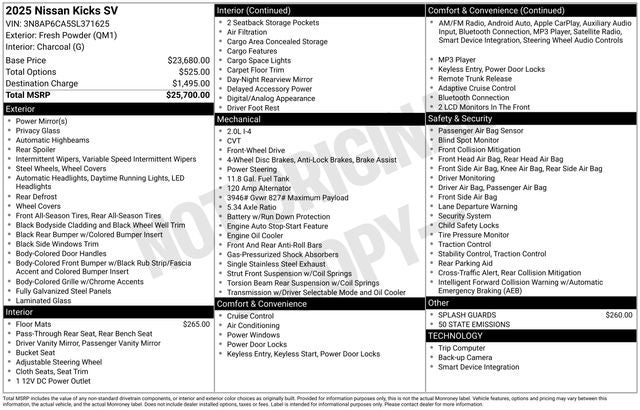 Elevate your driving experience with the 2025 Nissan Kicks SV. With its striking exterior design, impressive fuel efficiency, and wealth of advanced features, this crossover is the perfect blend of style, capability, and value. Visit our showroom today and discover how the Kicks SV can enhance your daily drives and weekend adventures.